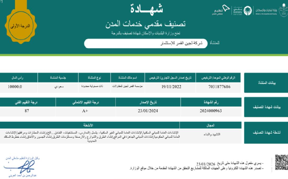انطلقت شركة القمر لجين للمقاولات في عام 2022 ، حيث نفذت عددًا من المشاريع الخاصة في عدة مدن داخل المملكة العربية السعودية، مدفوعة برؤية طموحة للنمو والتوسع في قطاع المقاولات، واستكمالًا لهذا المسار، تم في عام 2023 تأسيس شركة “لجين القمر للاستثمار”، بالشراكة مع نخبة من كبار المستثمرين، بهدف توسيع نطاق الأعمال لتشمل مجالي المقاولات والتطوير العقاري والاستثمارات وذلك بالإضافة إلى شركة القمر لجين للمقاولات لتكون الذراع الداعم لتنفيذ مشاريع المقاولات.