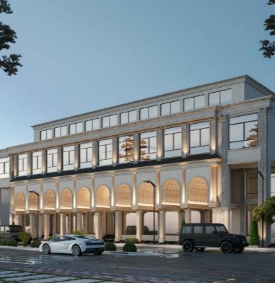 مبنى إداري حديث يتكون من ثلاثة طوابق وفوقهما طابقان لمواقف السيارات.