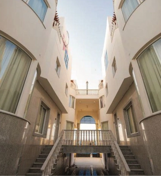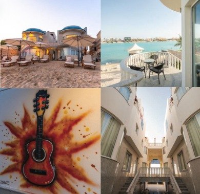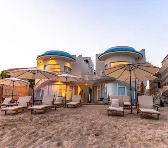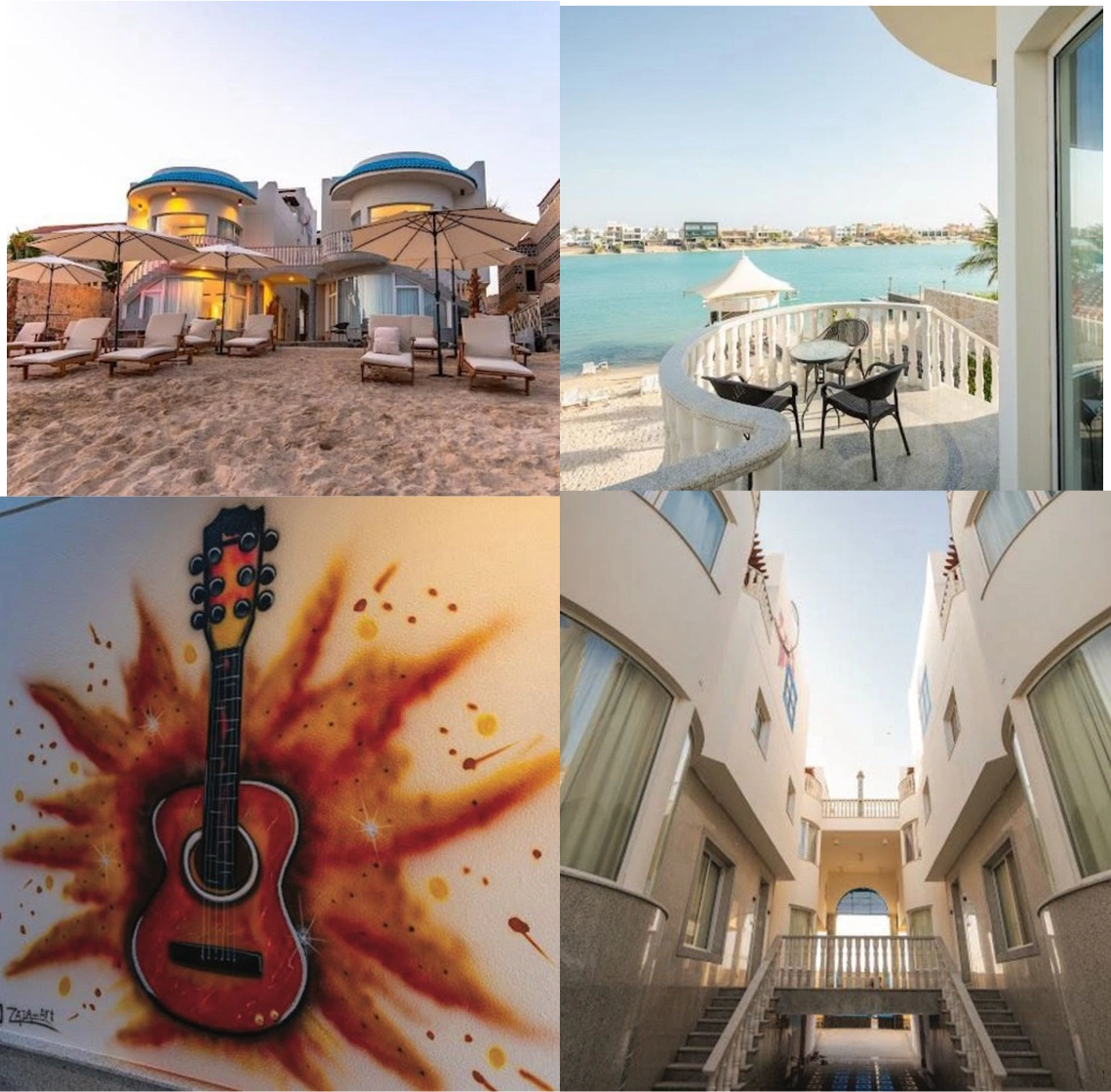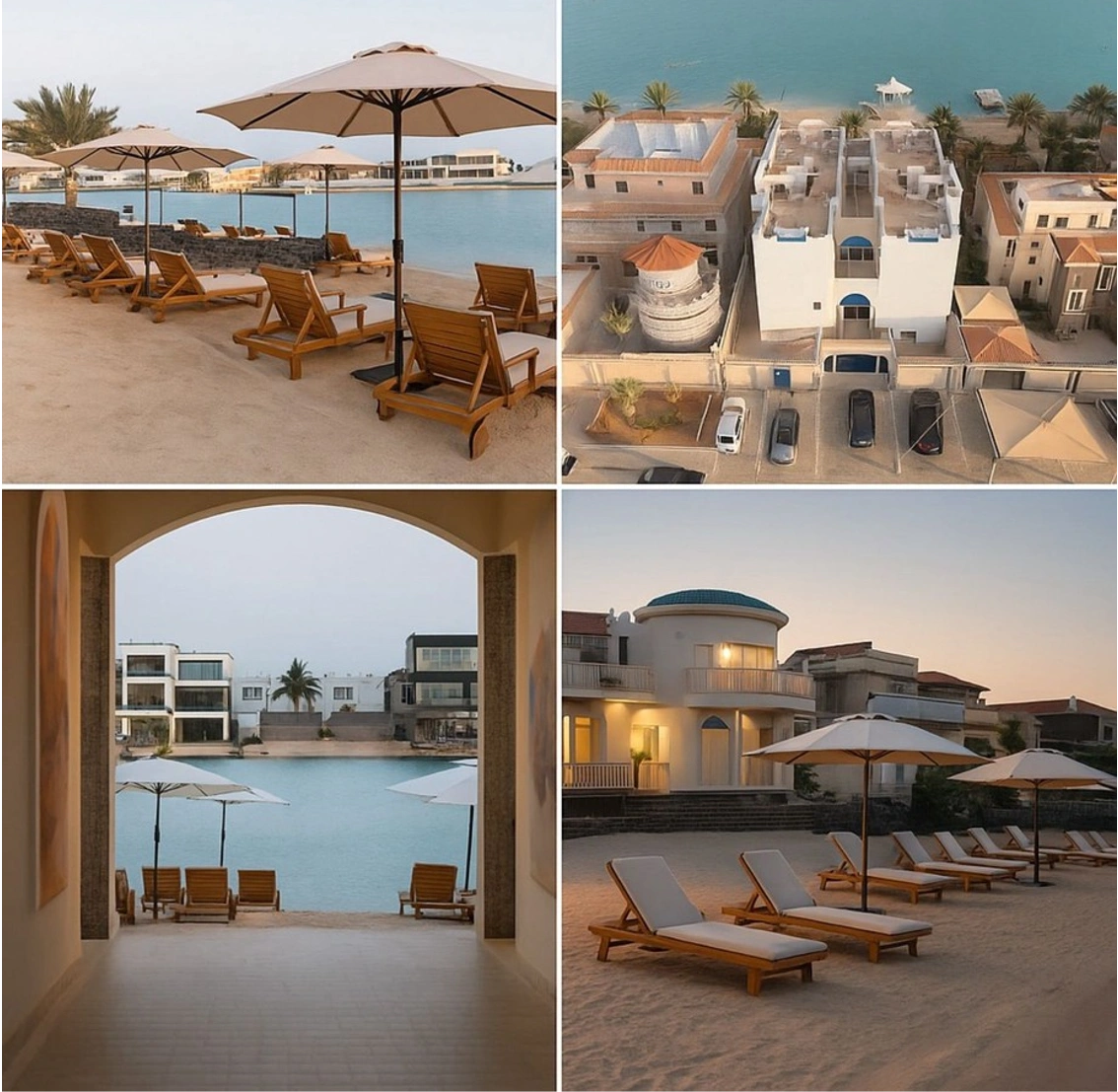 منتجع فاخر بشاطئ خاص يضم سبع وحدات سكنية تشمل خمس فلل بأربع غرف وصالة، وفيلا بغرفة وصالة، وجناحين بصالة وغرفة نوم ومطبخ.